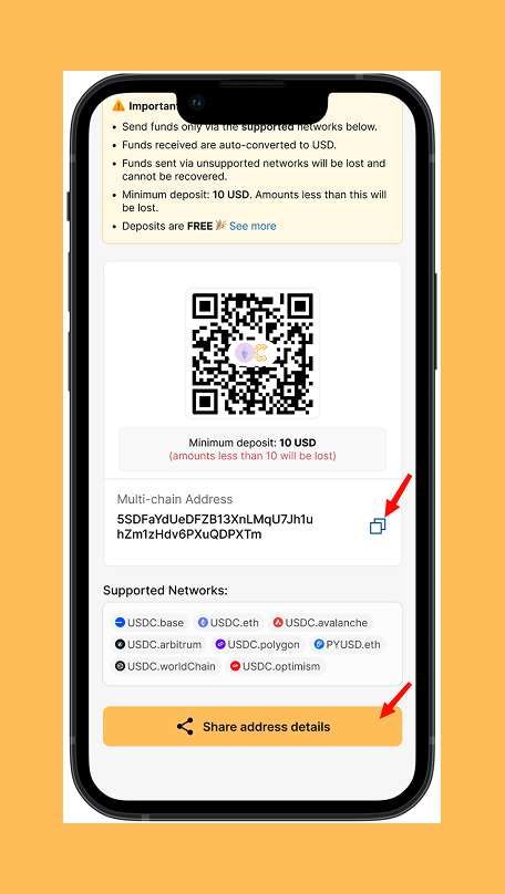 • Your wallet address stays the same, payments must be sent through a supported USDC network and unsupported networks or tokens will not go through.